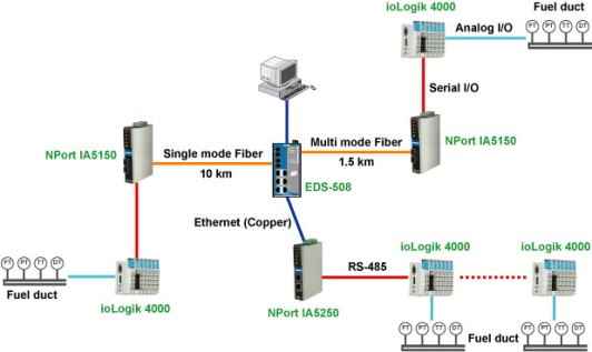 在石化行業中一個重要的課題是監視輸油管的狀態。但實際上最終還是利用人工來把數據進行整合,效率不是很高。而使用了 NPort IA 係列產品後,工程師可以直接通過以太網監視到油密度、油壓,溫度是否過高等狀態。此外,各量點的距離也可以達到1公裏,1.5 公裏甚至10公裏。在這個案例中光纖以太網的選擇讓係統的使用非常方便。 NPort IA 係列產品還取得了 Class I/Div II 防爆標準,它更好地證明了產品的安全性。 |
