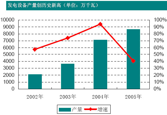 發電設備連續幾年高速增長,預計06年是高點。基於能源結構多元化調整以及環保、節能等幾方麵因素考慮,未來我國火電的比例將持續下降,發展的重點為30萬千瓦以上的大型機組。“十一五”期間,水電進入快速發展時期;核電發展戰略由“適當發展核電”轉變為“積極發展核電”。看好水電、核電裝備製造業。