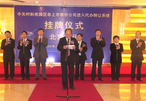 北京時代科技股份有限公司(證券簡稱:北京時代,證券代碼:430003)在深交所代辦股份轉讓係統的掛牌儀式於3月31日在深交所三樓大廳隆重舉行,儀式由深交所報價轉讓小組組長劉江紅主持,北京時代董事長彭偉民、董事王小蘭、董秘皮檢君作為貴賓參加了此次掛牌儀式,參加掛牌儀式的貴賓還有深交所陳鴻橋副總經理、國泰君安證券公司賈紹君副總裁等。上午9點45fen,guapaiyishizhengshikaishi,shouxianyoubeijingshidaidongshichangpengzongzhici,jiashaojunfuzongcaihechenhongqiaofuzongjingliyefenbiezuolefayan。zhihou,pengzongheshenjiaosuochenzonghuzenglipin,pengzongjiangyinyou“讓高科技與資本市場焊接起來”贈語的焊機模型贈給深交所,深交所將一個精製的琉璃樽贈給時代公司。上午10點,彭總和國泰君安賈總共同敲響開市寶鍾,來賓舉杯共飲香檳酒,祝賀掛牌儀式圓滿成功。