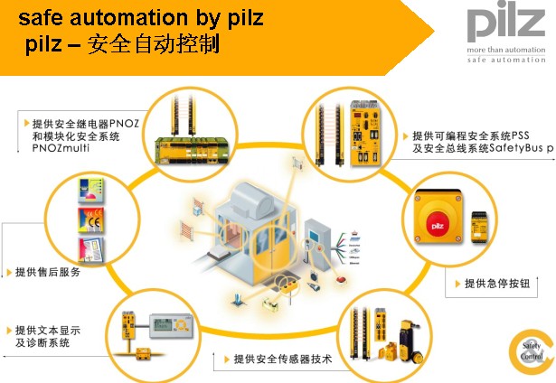 Pilz公司作為安全領域的大使在許多領域都有其的產品:PNOZ安全繼電器、PSS可編程安全係統和安全總線SafetyBus p。Pilz擁有一係列相互適用的產品,同時為客戶提供了各類應用合適的解決方案——無論您需要達到最簡單的安全要求,還是需要控製的複雜設備。