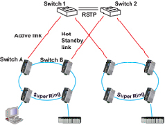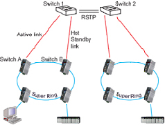 將Dual Homing 交換機接入到一個通訊模塊,這兩個端口可互相備援。在這種應用環境中,要求區別於不同VLAN組或IP子網,建立獨立的Super Ring。 此兩個Super Ring是相互獨立的,而不同的VLAN組或子網能通過路由到達.