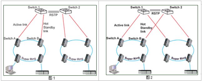 我們是通過將使用Super Ring 協議的兩個不同交換機的兩個端口與使用其它冗餘協議的交換機的兩個端口連接起來來實現冗餘的(請看圖1 和圖 2). 其qi中zhong一yi條tiao連lian結jie為wei活huo動dong連lian接jie,用yong作zuo傳chuan輸shu數shu據ju,另ling外wai一yi個ge連lian結jie則ze是shi作zuo備bei用yong。交jiao換huan機ji會hui持chi續xu不bu斷duan備bei用yong連lian接jie的de連lian通tong性xing,一yi旦dan連lian結jie發fa生sheng狀zhuang況kuang,會hui在zai數shu秒miao內nei將jiang活huo動dong連lian接jie切qie換huan到dao備bei用yong連lian接jie。