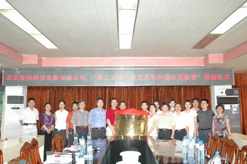 廣西工學院與北京亞控科技發展有限公司共建的實驗室——“組態王軟件聯合實驗室”捐贈暨揭牌儀式近日在柳州廣西工學院院辦二樓會議室舉行。亞控科技廣州分公司鄭炳權經理、廣西工學院李創第副院長,以及教務處、條tiao件jian裝zhuang備bei處chu領ling導dao和he電dian控kong係xi教jiao師shi代dai表biao等deng一yi同tong出chu席xi了le該gai儀yi式shi。儀yi式shi上shang,雙shuang方fang不bu僅jin簽qian訂ding了le實shi驗yan室shi合he作zuo共gong建jian協xie議yi,北bei京jing亞ya控kong科ke技ji還hai向xiang廣guang西xi工gong學xue院yuan提ti供gong了le自zi行xing研yan發fa生sheng產chan的de具ju有you領ling先xian水shui平ping的de組zu態tai王wang軟ruan件jian價jia值zhi人ren民min幣bi130萬元。