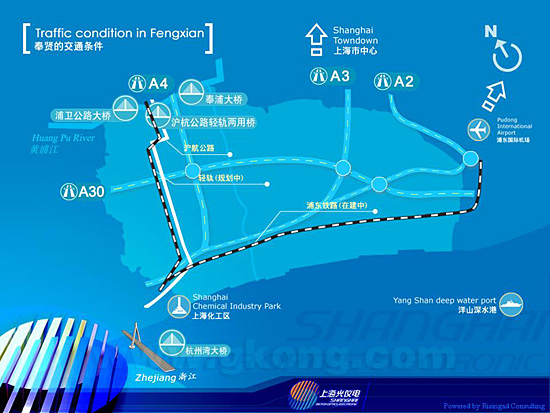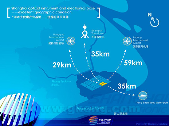 上海光儀電產業基地具有優越的區位條件。該基地距浦東國際機場59公裏,距虹橋國際機場29公裏,距市中心35公裏,距洋山國際深水港35公裏。其周邊逐步形成的與光儀電產業相關的產業基地,如閔行機電裝備產業群、臨港現代裝備製造業基地、金橋汽車基地、漕河涇集成電路產業群、張江高科技園區等,車程均在1小時之內,將有利於光儀電產業基地的產業配套、延伸和集聚,迅速形成產業規模。