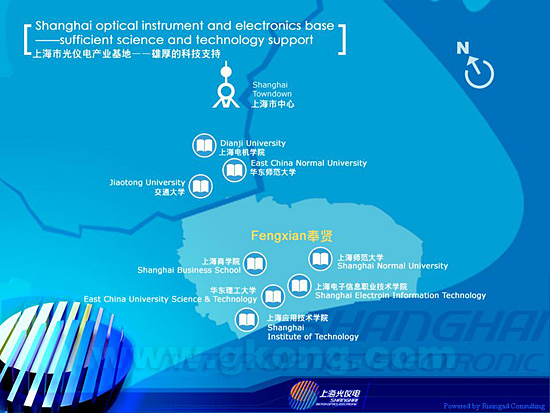 上海光儀電產業基地具有雄厚的科技支撐。上海的科研院所、高等院校集中,人才資源豐富,同時,產業基地周邊已有的上海交通大學、華東師範大學、上海師範大學、上海電機學院、上海商學院、上海電子信息職業技術學院以及即將開工建設的華東理工大學、上海應用技術學院等高等院校,為光儀電產業基地的發展提供強有力的產學研平台和人才資源。