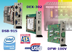 此DIN-3000係統標配有:CPU刀片式模塊 (DSB-915), 電源刀片式模塊 (DPW-100V) 和SATA 驅動器刀片式模塊(DEX-302)。DSB-915這個小型板具有低功耗,無風扇等優點,它采用Intel® Celeron® M 800MHz CPU (Zero Cache)平台,搭配Intel® 915GM 移動芯片組。DPW-100V這個100W 12V DC 輸入 ATX 電源模塊支持AC-DC 和DC-DC轉化。DEX-302配有SiliconImage Sil3132 芯片組,支持SATA II標準,傳輸速率可以達到3GB/s。