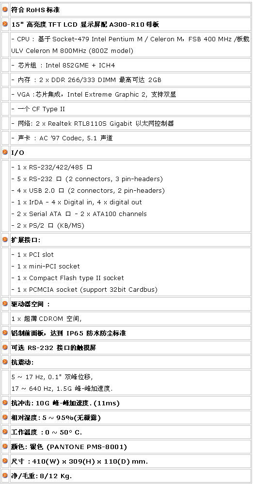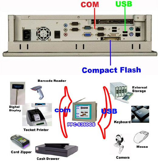 >全係列I/O設計:6 x COM (其中一個在內部,用於觸摸屏), 4 x USB, 1 x CF