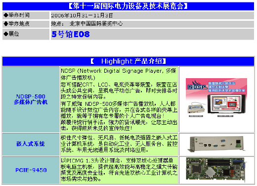 威強工業電腦股份有限公司為了拓展中國華北地區商機,服務更多華北當地企業應用工業電腦,於2006年10月31日(二)至11月3日(五)與當地北京經銷商威達通聯合參加第十一屆國際電力設備及技術展覽會。