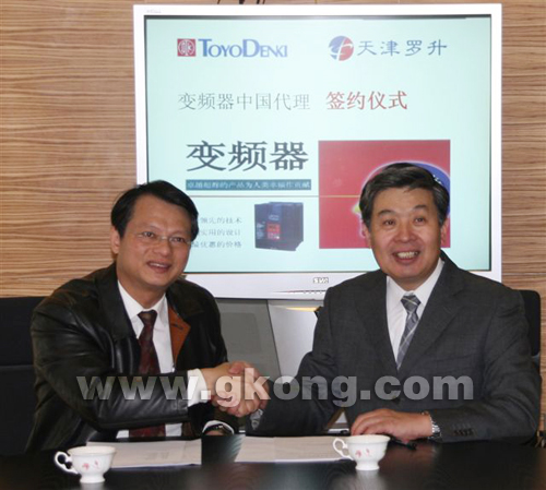 圖一:天津羅升陳總經理與ToyoDenki涉木部長簽訂代理合約,雙方握手,共同表示今後將齊心協力,為東洋變頻器開辟一片新天地