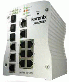 JetNet 5010G配備3個combo千兆口,每個千兆口都可以選用小巧的可插拔SFP模塊(mini-GBICs提供1000Base-SX, 1000Base-LX 或者 100Base-FX 連接) 和1個RJ-45千兆電口。交換機可以自動識別各千兆口線纜連接的優先級。用戶可以將JetNet 5010G兩個千兆端口,用光纖線材連接作為上連到千兆主幹網的鏈路,而用餘下的兩個千兆口(或光口或電口)組建千兆冗餘環網。SFP模塊可連接不同界麵的千兆口, 兼容性好,適用於大多數工業現場的應用。