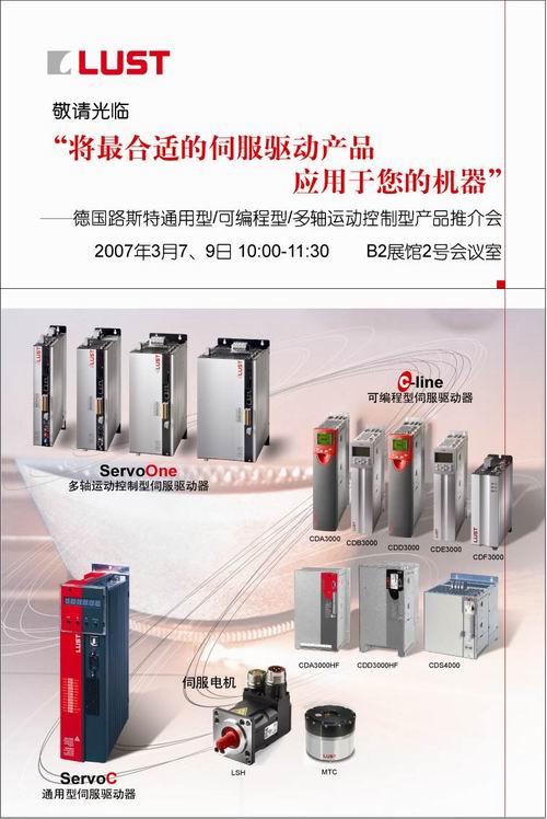 2007年 3月9 日 10:00-11:30 “將最合適的伺服驅動產品應用於您的機器”-德國路斯特通用型、可編程型、多軸運動控製型產品推介會。