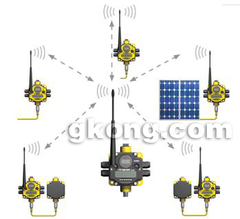 DX80無線傳感器網絡係統使用RS-485"Modbus RTU"進行數據傳輸(星狀拓撲結構),真正實現無線傳感。通過I/O的變化或者輪循(在規定時間內)的方式在設備間進行信息傳輸,監控網絡。