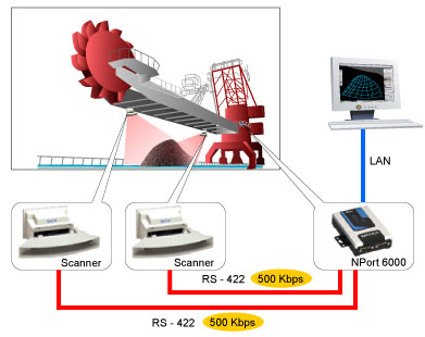 這(zhe)個(ge)裝(zhuang)載(zai)設(she)備(bei)用(yong)於(yu)一(yi)家(jia)上(shang)海(hai)公(gong)司(si)港(gang)口(kou)建(jian)設(she)的(de)第(di)二(er)階(jie)段(duan)項(xiang)目(mu),它(ta)的(de)主(zhu)要(yao)作(zuo)用(yong)是(shi)能(neng)夠(gou)自(zi)動(dong)處(chu)理(li)鐵(tie)礦(kuang)石(shi)的(de)裝(zhuang)卸(xie)工(gong)作(zuo)。它(ta)安(an)裝(zhuang)有(you)掃(sao)描(miao)設(she)備(bei),並(bing)自(zi)動(dong)產(chan)生(sheng)3D計ji算suan機ji模mo型xing,然ran後hou決jue定ding如ru何he處chu理li和he裝zhuang載zai這zhe些xie成cheng堆dui的de礦kuang石shi。由you於yu數shu據ju巨ju大da,所suo以yi就jiu意yi味wei著zhe常chang規gui的de數shu據ju傳chuan輸shu速su度du無wu法fa滿man足zu自zi動dong化hua處chu理li。這zhe個ge掃sao描miao設she備bei是shi由you世shi界jie領ling先xian的deSICK公司生產, 它被設置在38.4Kbps和500Kbps, 是高速且非標準的波特率。