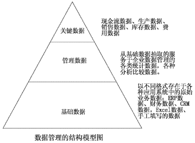 在企業範圍內,數據分為基礎數據、管(guan)理(li)數(shu)據(ju)和(he)關(guan)鍵(jian)數(shu)據(ju)三(san)層(ceng)。基(ji)礎(chu)數(shu)據(ju)是(shi)存(cun)在(zai)於(yu)各(ge)業(ye)務(wu)係(xi)統(tong)中(zhong)的(de)原(yuan)始(shi)數(shu)據(ju),管(guan)理(li)數(shu)據(ju)是(shi)對(dui)基(ji)礎(chu)數(shu)據(ju)的(de)抽(chou)取(qu)和(he)提(ti)升(sheng),關(guan)鍵(jian)數(shu)據(ju)是(shi)從(cong)管(guan)理(li)數(shu)據(ju)中(zhong)抽(chou)取(qu)出(chu)來(lai)定(ding)向(xiang)推(tui)送(song)給(gei)老(lao)板(ban)的(de)重(zhong)要(yao)決(jue)策(ce)支(zhi)持(chi)數(shu)據(ju)。如(ru)下(xia)圖(tu)所(suo)示(shi):