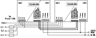 主zhu動dong式shi均jun衡heng電dian流liu的de並bing聯lian模mo式shi必bi須xu采cai用yong一yi根gen附fu加jia的de均jun流liu線xian,這zhe根gen均jun流liu線xian作zuo為wei反fan饋kui信xin號hao傳chuan送song到dao電dian源yuan的de控kong製zhi器qi來lai調tiao節jie每mei個ge電dian源yuan在zai所suo有you的de條tiao件jian下xia提ti供gong相xiang同tong的de輸shu出chu電dian流liu,這zhe時shi,電dian源yuan電dian壓ya輸shu出chu的de軟ruan特te征zheng是shi不bu需xu要yao的de,輸shu出chu電dian壓ya在zai任ren何he場chang合he下xia不bu受shou電dian流liu大da小xiao的de影ying響xiang,所suo以yi與yu被bei動dong式shi均jun衡heng電dian流liu相xiang比bi,其qi輸shu出chu電dian壓ya精jing度du高gao,同tong時shi與yu輸shu出chu電dian路lu的de類lei型xing無wu關guan;danshiduiyukaifaheanzhuanglaishuo,feiyongjiaogao,yinweizaidianyuanneibuxuyaoyigejingquedujiaogaodedianliuceshixianluheyigefujiadedianliutiaojieqi,tongshiyeduoyigejiexianduankou。PULS電源的SL40.301三相24/40A的電源采用這種技術,所有的電源經過均流線和地線相連接,如圖4所示。