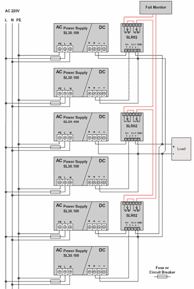 圖5表示了一個采用PULS電源實現的5+1的冗餘電源的方案。其輸出功率為3 600W/24V/150A的並聯式冗餘電源。這個方案采用了6個SL30.100和3個SLR02的冗餘模塊。3個SLR02的冗餘模塊將所有的電源工作狀態串接起來,成為一個綜合信號送入控製係統進行監控。每個SLR02的冗餘模塊都能顯示所連接的電源工作狀態,隔離二極管也防止了輸出回路的短路現象的出現。