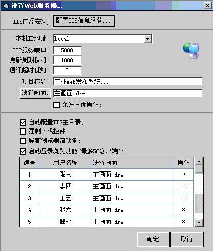 4、 WebServer的組態使用非常簡單,隻需要組態遠程用戶名稱和密碼,以及可以瀏覽的畫麵就可以了;