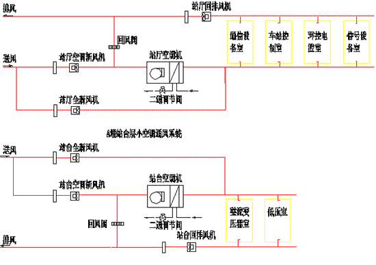 2) 送風:送風分為送全新風、混風(新風+回風)、全回風三種情況;送風經過製冷、除濕、過濾及消音,然後送到站廳、站台及各設備房。也可不經過製冷和除濕直接送風。