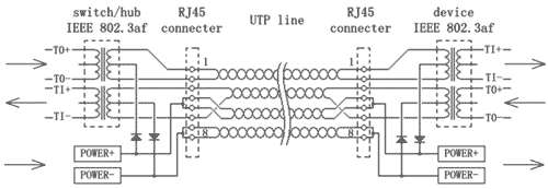 (4) 以太網的供電問題,多年來一直是一個缺陷,特別是隨著IP電話、IP攝像機、無線AP、ENC(Ethernet Control System)dengxitongdeyingyong,renmengengtichuyitaiwangzaichuanshushujudetongshi,chuansongbufennengliang,yimanzuxiaoxingwangluoshebeiyongdiandexuqiu,jiejuexiaoxingwangluoshebeigongdiandewuxuzhuangtaihejugaobuxiadedianyuanbuxianchengben。yinciIEEE 802.3af標準呼之即出,已形成一個以太網供電的國際標準,目前3COM、華為、DLINK等公司都有符合802.3af標準的交換機產品。IEEE 802.3af 標準的核心是在滿足802.3 標準的同時,由交換機向網絡終端設備提供48V或24V電源,至此工業以太網的供電問題得到很好的解決,其原理如圖5所示。