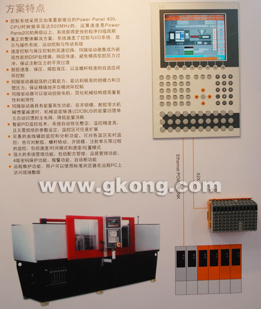 最後,何新鋒先生總結說,一直執著追求“完美自動化”的貝加萊,經過幾十年的發展,在塑料行業積累了豐富的經驗。在2007國際橡塑展上,貝加萊帶來很多塑料機械控製技術的解決方案,比如:液(ye)壓(ya)型(xing)控(kong)製(zhi)機(ji)械(xie)控(kong)製(zhi)方(fang)案(an),全(quan)電(dian)動(dong)機(ji)械(xie)控(kong)製(zhi)方(fang)案(an),吹(chui)瓶(ping)機(ji)控(kong)製(zhi)方(fang)案(an),中(zhong)空(kong)成(cheng)型(xing)機(ji)械(xie)壁(bi)厚(hou)控(kong)製(zhi)方(fang)案(an),擠(ji)出(chu)機(ji),壓(ya)鑄(zhu)機(ji),吹(chui)膜(mo)機(ji),內(nei)冷(leng)控(kong)製(zhi)器(qi)等(deng)各(ge)種(zhong)塑(su)料(liao)機(ji)型(xing)的(de)控(kong)製(zhi)方(fang)案(an)。