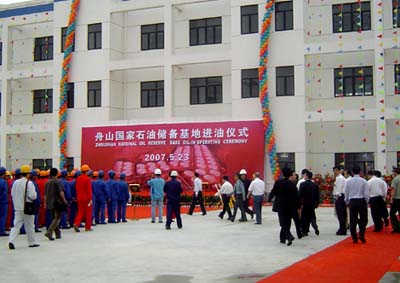 隨著國家發改委能源局副局長一聲令下,滾滾的中東原油注入了一期工程的4#、5#、6#油罐。舟山國家石油儲備嶴山基地的成功通油,標誌著我國能源戰略的一期工程已初建成效。