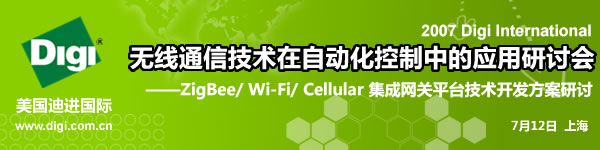 主題: 2007 Digi International 無線通信技術在自動化控製中的應用研討會 時間: 2007年7月12日(星期四)下午 13:15-17:00 地點: 上海建國賓館 四樓九州廳B (上海市漕溪北路439號,地鐵一號線徐家彙站)