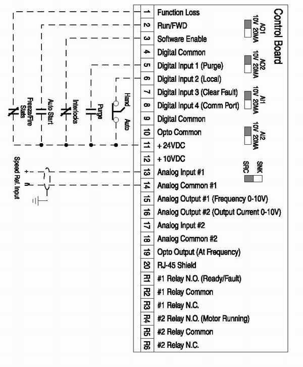 兩個(2)模擬量輸入(一個單極型和一個雙極型)是通過DIP開關來選擇電壓或電流輸入。一個輸入出與其餘的變頻器I/O斷口隔離。
