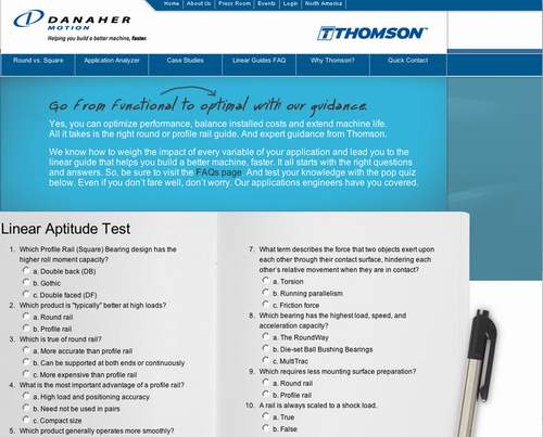 www.linearguidance.danahermotion.com,該gai網wang站zhan不bu僅jin幫bang助zhu用yong戶hu對dui直zhi線xian導dao軌gui進jin行xing功gong能neng選xuan擇ze,還hai可ke幫bang助zhu他ta們men為wei特te定ding應ying用yong選xuan擇ze最zui合he適shi的de導dao軌gui。用yong戶hu訪fang問wen該gai網wang站zhan的de用yong戶hu可ke通tong過guo線xian性xing能neng力li測ce驗yan(Linear Aptitude Test)了解圓形軌和方形軌技術和相關解決方案,通過問答部分解答疑惑,還可通過功能強大的Application Analyzer應用分析工具為特定選擇應用解決方案。