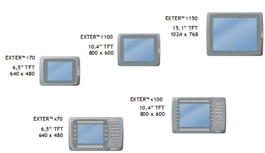 EXTER係列人機界麵共包含14中機型,7個不同尺寸與規格的觸摸式機型,6個不同尺寸的按鍵式機型,1個手持式機型。