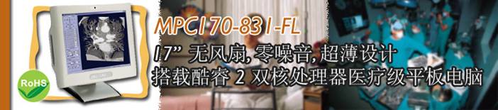 艾訊的 MPC170-831-FL 是一款 17 寸醫療級平板液晶計算機,符合美國 UL 醫規條款 UL60601-1 與歐洲 TUV 醫規條款 EN60601-1 規定,以及通過 FCC Class B 的電磁幹擾 (EMI) 認證。此款 17 寸醫療級平板電腦整機皆達到 IPx1 防水標準,有效提升係統可靠性,能滿足大多數的醫療院所日常所需的消毒程序,給使用者更安全、可靠且易於操作的無風扇解決方案。再者,其保留兩組 1394a 接口可供用戶連接高畫質的專業醫療攝影機。MPC170-831-FL 支持一組 PCI 擴展接口,並提供一組輕巧超薄的 Combo 光驅以備選購,內建無線網絡天線 (802.11b/g),可方便快捷地實現網絡功能。此外,該款醫療平板電腦還支持兩組千兆以太網口,提供用戶超高速且穩定的網絡傳輸功能;再者,該機種既有超薄且專業美觀的外型設計,更有易於使用者操作的輸入輸出界麵,是為一款兼具高性能、低功耗、零噪音、高可靠性於一身的優秀工業設計品。