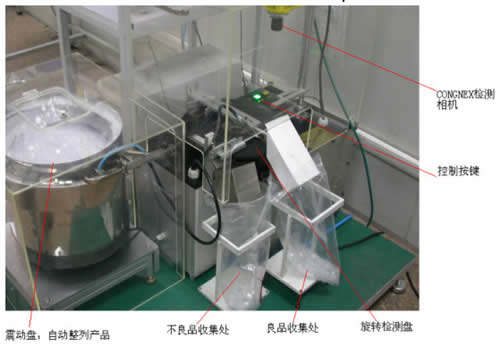 自動化視覺檢測機根據以下原理:震動盤將產品整列而出,產品流到轉盤上,轉盤轉動,產品經過光纖時觸發智能相機拍照處理,智能相機將處理結果傳送給PLC,PLC驅動執行部件將良品和不良品分別收集。該設備可應用於電子、塑料和連接器等行業。