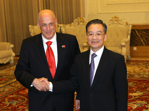 12月13日,國務院總理溫家寶在北京人民大會堂會見出席第三次中美戰略經濟對話的美國總統布什的特別代表、財政部長保爾森等美方代表團主要成員。(新華社記者龐興雷攝)