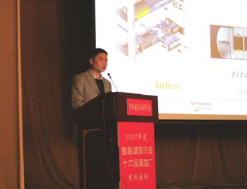 施耐德電氣VDI技術主管張磊先生應邀在會上做了熱情洋溢的演講,演講主題為“構築堅實的政府信息化網絡平台”。張磊先生由施耐德電氣的悠久曆史及雄厚實力展開,就施耐德電氣VDI今年的若幹成功案例尤其在政府工程(如深圳西部通道、國家商務部、北京電力指揮中心、濟南政務中心、奧運數字北京大廈等等)中的卓越成績進行了深入介紹。演講過程中,場下觀眾不時傳來熱烈的掌聲。