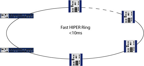 支持Fast HIPER-Ring的網管型交換機連接成一個環網,為避免網絡中的回路,將一台交換機設為冗餘管理者。這台管理交換機以1毫秒為間隔發出測試幀,如果有三個連續的幀未返回,則備用鏈路在10毫秒內被啟動。