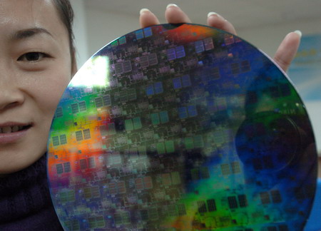 科研人員展示一張刻有電子芯片電路圖的成品晶元