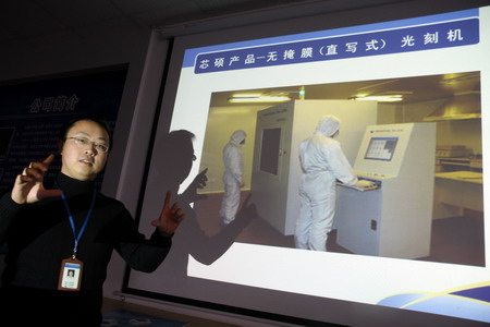 科研人員通過投影儀介紹國內首台自主知識產權光刻機
