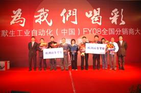 經過艾默生公司市場人員和全國各工控產品分銷商的不懈努力和積極開拓,艾默生工控產品的銷售在FY07取(qu)得(de)了(le)驕(jiao)人(ren)的(de)業(ye)績(ji),並(bing)在(zai)一(yi)些(xie)新(xin)的(de)重(zhong)點(dian)行(xing)業(ye)和(he)新(xin)客(ke)戶(hu)處(chu)取(qu)得(de)突(tu)破(po),客(ke)戶(hu)的(de)認(ren)知(zhi)和(he)認(ren)可(ke)度(du)得(de)到(dao)進(jin)一(yi)步(bu)提(ti)升(sheng),新(xin)產(chan)品(pin)推(tui)廣(guang)會(hui),行(xing)業(ye)展(zhan)示(shi)會(hui),技(ji)術(shu)交(jiao)流(liu)會(hui)蓬(peng)勃(bo)展(zhan)開(kai),建(jian)立(li)起(qi)了(le)一(yi)定(ding)的(de)品(pin)牌(pai)地(di)位(wei)。在(zai)激(ji)烈(lie)的(de)市(shi)場(chang)競(jing)爭(zheng)中(zhong),湧(yong)現(xian)出(chu)了(le)一(yi)批(pi)批(pi)優(you)秀(xiu)的(de)分(fen)銷(xiao)商(shang)和(he)個(ge)人(ren),在(zai)答(da)謝(xie)晚(wan)宴(yan)上(shang),艾(ai)默(mo)生(sheng)對(dui)這(zhe)些(xie)人(ren)員(yuan)進(jin)行(xing)了(le)表(biao)彰(zhang)和(he)嘉(jia)獎(jiang),評(ping)選(xuan)出(chu)年(nian)度(du)優(you)秀(xiu)分(fen)銷(xiao)商(shang),頒(ban)發(fa)了(le)市(shi)場(chang)拓(tuo)展(zhan)獎(jiang)以(yi)及(ji)維(wei)護(hu)獎(jiang),起(qi)到(dao)了(le)良(liang)好(hao)的(de)激(ji)勵(li)作(zuo)用(yong)。