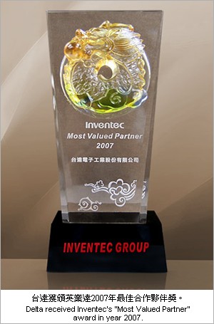 台達電子高階電源事業部因持續不斷提供英業達高質量的服務器電源解決方案與服務,獲得英業達頒發2007年最佳合作夥伴獎,以表彰台達電子傑出的研發、生產效率與快速響應客戶需求的能力,這也是台達團隊連續第三年獲頒此殊榮。