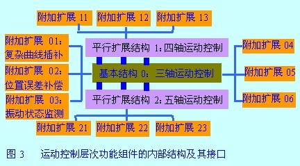 附加層分為兩種:補充擴展和平行擴展。補充擴展是在原有組件的基礎上通過開放新的接口配置不同的控製軟件形式來實現係統的功能擴展;平(ping)行(xing)擴(kuo)展(zhan)是(shi)完(wan)全(quan)增(zeng)加(jia)一(yi)個(ge)同(tong)等(deng)結(jie)構(gou)的(de)功(gong)能(neng)組(zu)件(jian),來(lai)實(shi)現(xian)係(xi)統(tong)一(yi)種(zhong)特(te)殊(shu)的(de)控(kong)製(zhi)要(yao)求(qiu)或(huo)開(kai)辟(pi)一(yi)個(ge)新(xin)的(de)控(kong)製(zhi)通(tong)道(dao)。區(qu)分(fen)這(zhe)兩(liang)種(zhong)擴(kuo)展(zhan)方(fang)式(shi)意(yi)義(yi)在(zai)於(yu):充(chong)分(fen)利(li)用(yong)兩(liang)種(zhong)不(bu)同(tong)繼(ji)承(cheng)形(xing)式(shi),即(ji)結(jie)構(gou)性(xing)繼(ji)承(cheng)和(he)接(jie)口(kou)性(xing)繼(ji)承(cheng)。附(fu)加(jia)擴(kuo)展(zhan)遵(zun)循(xun)接(jie)口(kou)性(xing)繼(ji)承(cheng),以(yi)功(gong)能(neng)點(dian)的(de)形(xing)式(shi)嵌(qian)入(ru)到(dao)係(xi)統(tong)組(zu)件(jian)的(de)接(jie)口(kou)層(ceng)麵(mian),這(zhe)一(yi)特(te)征(zheng)可(ke)以(yi)方(fang)便(bian)地(di)將(jiang)對(dui)個(ge)別(bie)功(gong)能(neng)的(de)擴(kuo)展(zhan)要(yao)求(qiu)的(de)實(shi)現(xian)形(xing)式(shi)標(biao)準(zhun)化(hua),滿(man)足(zu)用(yong)戶(hu)隨(sui)時(shi)出(chu)現(xian)的(de)自(zi)定(ding)義(yi)需(xu)求(qiu)。平(ping)行(xing)擴(kuo)展(zhan)遵(zun)循(xun)結(jie)構(gou)性(xing)繼(ji)承(cheng),以(yi)功(gong)能(neng)組(zu)整(zheng)體(ti)的(de)形(xing)式(shi)複(fu)製(zhi)一(yi)個(ge)全(quan)新(xin)的(de)功(gong)能(neng)通(tong)道(dao),與(yu)原(yuan)有(you)層(ceng)次(ci)形(xing)成(cheng)平(ping)行(xing)的(de)控(kong)製(zhi)方(fang)案(an),這(zhe)一(yi)特(te)征(zheng)可(ke)以(yi)將(jiang)開(kai)放(fang)結(jie)構(gou)的(de)整(zheng)體(ti)性(xing)擴(kuo)展(zhan)運動控製模塊是數控係統的核心組件,基於開放結構的運動控製組件必須具備平行擴展和附加擴展兩種接口形式(見圖3)。平行擴展用於控製軸數的擴充,在基本三軸控製的基礎上,衍生出具備同種功能特性的四軸和五軸組件;fujiakuozhanyongyuteshugongnengdefujia,shiduiyonghukaifangdezidingyigongnengshixianjiekou,jibenzujianheyoupingxingkuozhanyanshengchudezujiandoujubeitongdengdefujiakuozhanjiekou。tusanzhanshileyigejibensanzhou運動控製組件平行擴展為四軸和五軸運動控製組件,每個運動組件附加擴展了複雜曲線插補,位置誤差補償和振動狀態監測三個特殊功能。