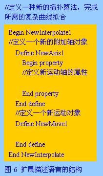 二次開發環境包括語言描述和引導設置兩種開發方式:yuyanmiaoshufangshicaiyongjiegouhuadegongnengjizhi,yuxiandingyichuxitongkuozhandesuanfajiegou,yonghuzhixugenjusuanfadetishijiaruzijidegongnengyaoqiudemiaoshu。ercikaifapingtaitigongdulidejiegouhuamiaoshuyuyan(如圖6所示語法結構),采cai用yong麵mian向xiang對dui象xiang的de編bian程cheng思si想xiang,以yi功gong能neng對dui象xiang群qun組zu的de構gou成cheng方fang式shi來lai完wan整zheng描miao述shu數shu控kong組zu件jian對dui象xiang的de特te定ding工gong作zuo狀zhuang態tai。語yu言yan描miao述shu方fang案an,可ke以yi通tong過guo靈ling活huo定ding義yi的de算suan法fa規gui範fan深shen入ru係xi統tong內nei部bu的de軟ruan件jian構gou成cheng細xi節jie,適shi用yong於yu係xi統tong底di層ceng策ce略lve方fang案an的de自zi定ding義yi配pei置zhi。引yin導dao設she置zhi采cai用yong開kai發fa向xiang導dao的de形xing式shi(如圖7所示開發界麵)以圖形話詢問界麵來定製用戶的擴展需求,一般用於較為簡單的擴展開發。這兩種機製結合起來,也構成了二次開發的層次化結構。