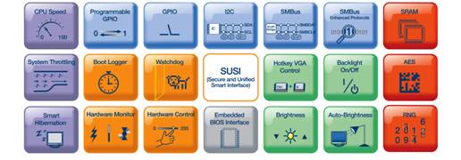 研華開發了SUSI 應用程序接口 (Secure 和 Unified Smart Interface)。它是一組人性化的整合應用程序接口 (API),可以加快開發進度、提高安全性並為研華產品用戶提供增值。它在研華平台和客戶縱向應用之間起到了催化劑的作用。SUSI 為客戶提供了 5 個人性化模塊:控製、顯示、監視、節能和安全。