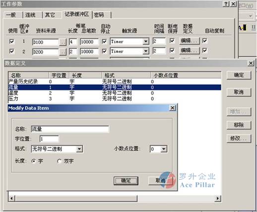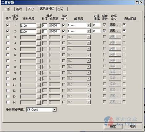 1.在工作參數設定中設定紀錄緩衝區,在“備份存儲裝置”中選擇“CF Card”或“USB Memory Card”這樣,人機每采樣一次,就會將數據自動備份到CF卡或者U盤,如圖一。