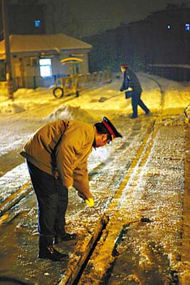 在安徽蚌埠宏業路大板樓道口,鐵路工人正剔除鐵軌裏的冰碴