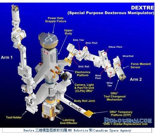 近日,加拿大建造了一個專門用於空間站的靈活操作機器人Dextre,並計劃於2008年3月11日發射到國際空間站上,加入到原本就用在該空間站上的操作機器人Canadarm2。該機器人長3.7米,將作為Canadarm2的操作終端,但他同時也能夠獨立操作。該種機器人將使宇航人員減少危險的出艙行走,幫助宇航員來修補空間站。