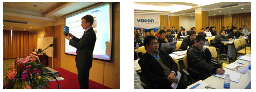 會上,來自Vacon芬蘭總公司的產品經理Antti Vuola先生對Vacon 10新產品作了精彩的介紹。從微型產品的市場占有率談起,這充分體現出Vacon 10的推出是適應變頻器發展的趨勢以及滿足市場的需求。隨後結合Vacon 10樣機對產品的技術數據,產品構造,功能特性,典型應用作了生動的介紹,特別是對可為OEM用戶提供量身定製的產品作了詳細說明。