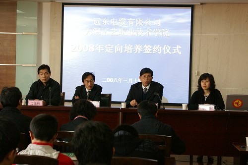 3月14日,遠東電纜有限公司與無錫工藝職業技術學院定向培養簽約儀式在宜興舉行,協議委托無錫工藝職業技術學院在2008年參加全國普通高考的江蘇籍高中畢業生中錄取、培養電線電纜製造技術專業(三年製普通專科)學生100名。這是繼2007年9月首次與無錫工藝職業技術學院成功合作後,遠東電纜的又一筆“人才訂單”。遠東控股集團副總裁羅時龍、行政總部總經理助理佟海燕、無錫工藝職業技術學院校長劉宣飛、副校長過元偉等出席了簽約儀式。