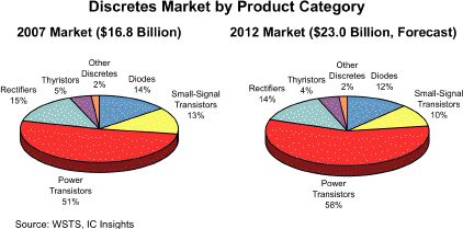 由於功率晶體管穩步增長,以及電子技術的普遍應用,目前預計2008年分立產品銷售額將增長7%,創出180億美元的紀錄新高。自2000年創出年度銷售額最高紀錄之後,該領域的銷售額下降了1.14億美元。上述報告顯示,分立市場(包括二極管、小信號晶體管、整流器、半導體閘流管和功率晶體管)2007-2012年的複合年增率為6%,五年內達到230億美元。自上世紀80年代以來,分立產品銷售額一直以6%的複合年增率增長。