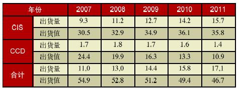 據iSuppli市場調研公司預測,世界圖像傳感器市場2007年的出貨量為10.95億個,比上年增長19%,預期到2013年將增長到20億個,年均增長率超過10%。而從出貨值講,自2006年登頂之後,在價格跌跌不休的情況下,有日漸趨緩之勢。2007年市場規模為54.87億美元,2011年將僅及46.63億美元,平均每年以5%的速度縮小。