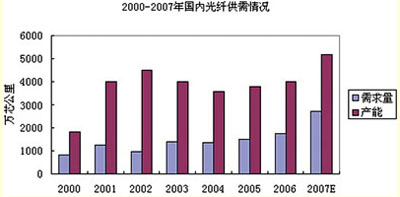 2008年國內光通信市場規模將進一步擴大。根據網通發布的公告,網通預計投資150億元開始實施部分地區光纖到戶,該計劃涉及的資產規模可達150億元。同時隨著村村通工程、西部大開發、奧運規劃以及2010年世博會等國家級基礎設施工程建設的全麵鋪開,中國光通信市場的市場規模將進一步擴大。預計2008年國內光纖的產量將達到6200萬芯公裏,同比增長約19%。