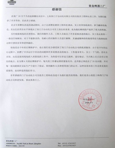 與此同時,西門子工程師吳俊傑也得到了青島啤酒二廠的特別感謝。青島啤酒二廠給吳公工的感謝信裏說,吳工在青島啤酒二廠20wanqianshenggaizaoxintanghuaxiangmuzhongbujindandanglelianghaodefanyi,hairenzhendebangzhunalidegongchengrenyuanjiejuelecaozuozhongdenanti。zaihouqiweihuzhong,wugongyegaoxiaolvdejiejuelexuduojiqiyunxingzhongcunzaidewentihexuyaogailiangdedifang,weigaigongsibimianlebubiyaodesunshi。